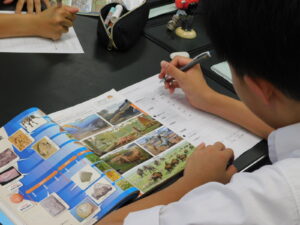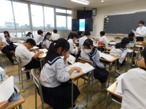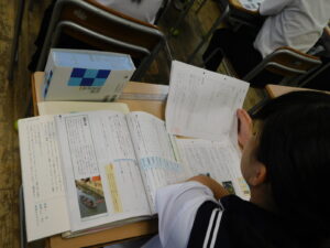 「魯迅」のものの考え方、捉え方を知るために、教科書をじっくり読み深めていました。また、難しい語句の意味を調べるために、辞書を携行している生徒がたくさんいました。普段から少しずつ学びを深めていこうとする姿勢が感じられます。