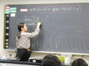 理科の授業で「生物の進化」について学習しました。本時の学習課題について、生徒とやりとりしながら設定する等したことで、生徒の学ぶ意欲が高まっていました。