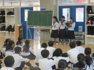 9月17日(水)6限の学年集会では、体育大会での学年種目の内容について、学年議会の生徒から説明がありました。その後、各団に分かれて作戦会議を行いました。