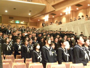 スローガン「奏~響け!我らが紡ぐ歌のシンフォニー~」のもと、各学級が練習の成果を発揮し、美しい歌声をホールに響かせていました。