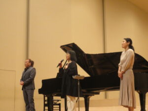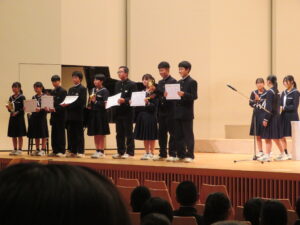 全ての学級が合唱を終えた後、審査員の方々によるミニコンサートが行われました。プロの声量と演奏技術に圧倒されていました。講演後に、発声の真似をしている生徒もおり、とてもインパクトがあったようです。