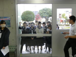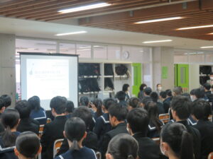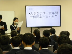 11月11日(火)と13日(木)の2日間にわたり、校区の小学校6年生を対象とした「中学校活動参観」が行われました。オリエンテーションでは、現在の中学1年生代表生徒が中学校生活について説明したり、質問に答えたりしていました。