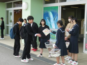 朝の登校時には、交通安全キャンペーンとして、生徒会ボランティアがチラシやティッシュを生徒玄関で配布し、交通安全の呼びかけを行いました。