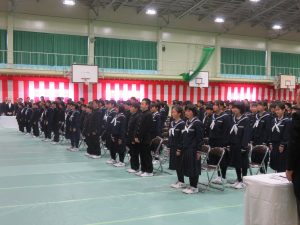 学校長の式辞では、教育目標である「自ら考え実践する生徒」を目指し、具体的には「思いやりの心をもち、行動する生徒」「気付き、考え、追究する生徒」「心身共に健康で、目標達成に向けて努力する生徒」という3つの生徒像に近付くよう、仲間を励まし合いながらお互いに高め合い、意義のある3年間にしてほしいという話がありました。