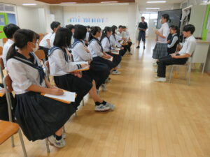 生徒たちは、メモを取りながら集中して話を聞いていました。質問コーナーでは「一番楽しい学校行事は何ですか」、「○○部の活動時間はどれくらいですか」と前のめりで聞いていました。